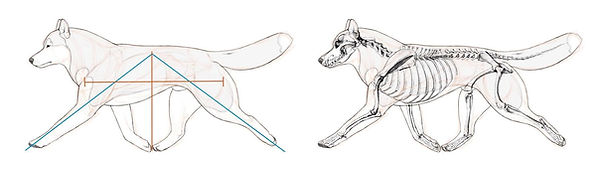 The Siberian Husky's characteristic gait is smooth and seemingly effortless. He is quick and light on his feet, and when in the show ring should be gaited on a loose lead at a moderately fast trot, exhibiting good reach in the forequarters and good drive in the hindquarters. When viewed from the front to rear while moving at a walk the Siberian Husky does not single-track, but as the speed increases the legs gradually angle inward until the pads are falling on a line directly under the longitudinal center of the body. As the pad marks converge, the forelegs and hind legs are carried straightforward, with neither elbows nor stifles turned in or out. Each hind leg moves in the path of the foreleg on the same side. While the dog is gaiting, the topline remains firm and level. Faults - Short, prancing or choppy gait, lumbering or rolling gait; crossing or crabbing